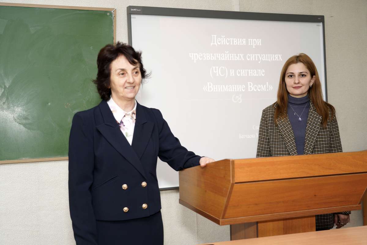 Уполномоченный по делам гражданской обороны и чрезвычайным ситуациям КЧГУ Халимат Магометовна Батчаева провела лекцию для студентов, обучающихся по направлению «Социальная работа». Темой встречи стали действия в чрезвычайных ситуациях и алгоритм поведения при поступлении сигнала “Внимание всем!”.